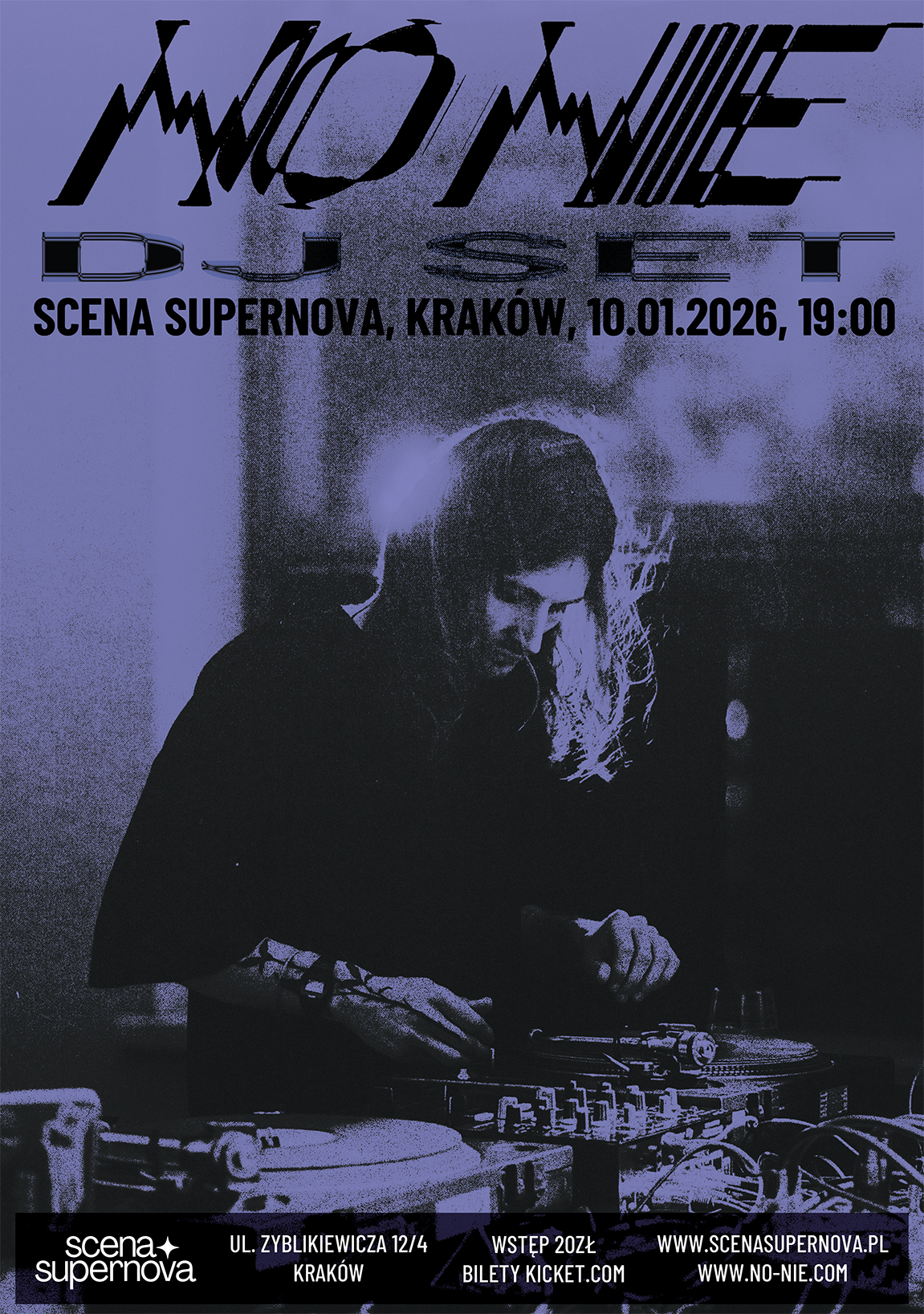Już w drugi weekend stycznia, tj. sobota 10.01.2026 w krakowskiej Scena Supernova będę miał przyjemność zagrać - kolejny z serii - NO NIE DJ set. Start 19:00, wejście od 18:30. Unikalna setlista składać będzie sie z utworów jeszcze niewydanych, tych z najnowszego albumu Into My World jak i VB czy Kenopsia. Wstęp 20zł, bilety dostępne na kicket.com. Czas trwania to około 1.5h.